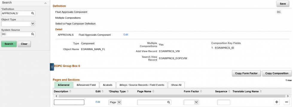 - The Approvals definition the only definition currently registered for Page Composer. Use the Search pane to search for the Approval transactions that are registered to AWE
