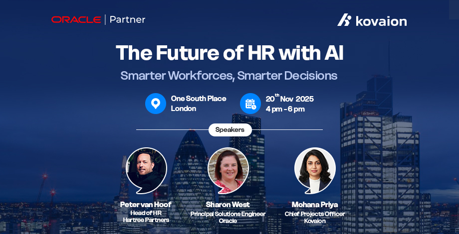 Kovaion invites HR leaders, business executives, and technology specialists to an exclusive executive briefing exploring how AI and Oracle Cloud HCM are reshaping HR operations across the employee lifecycle. From recruitment to performance management and career development, discover how AI empowers organizations to make data-driven decisions, streamline workflows, and elevate workforce engagement.
