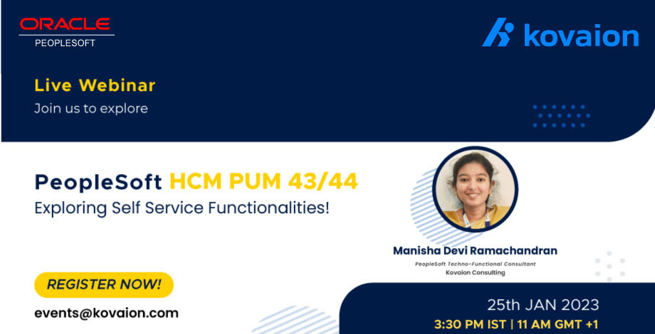 There are some very exciting features around the PeopleSoft Self-Service Functionalities in the last two Oracle PeopleSoft HCM PUM images (43-44). Kovaion is back with an interesting Webinar explaining “Self-Service Schedule” and “Absence Balance/Forecast”.